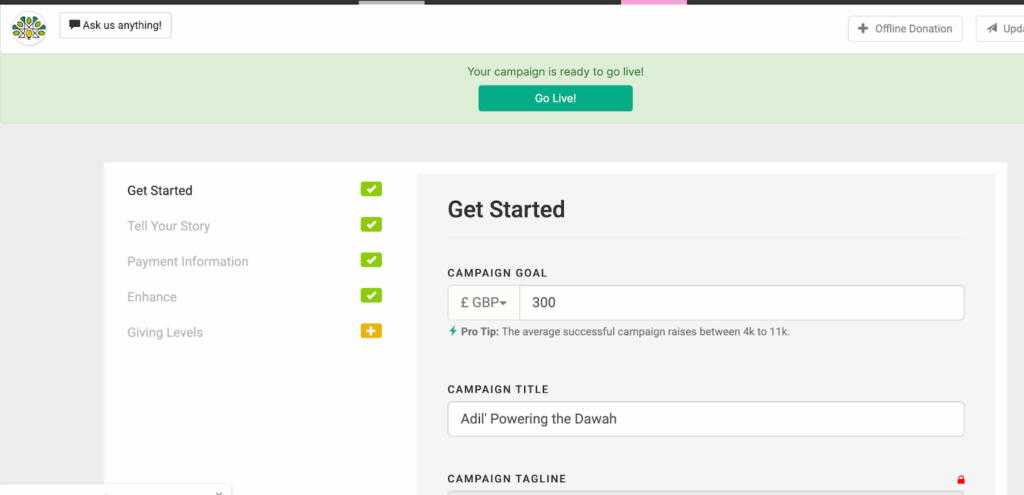 Now you’re ready to officially launch your campaign! Click “Go Live” and start sharing your shortlink far and wide. Tell your story, explain why you’re passionate about supporting the Dawah, and encourage others to join you in making a difference.